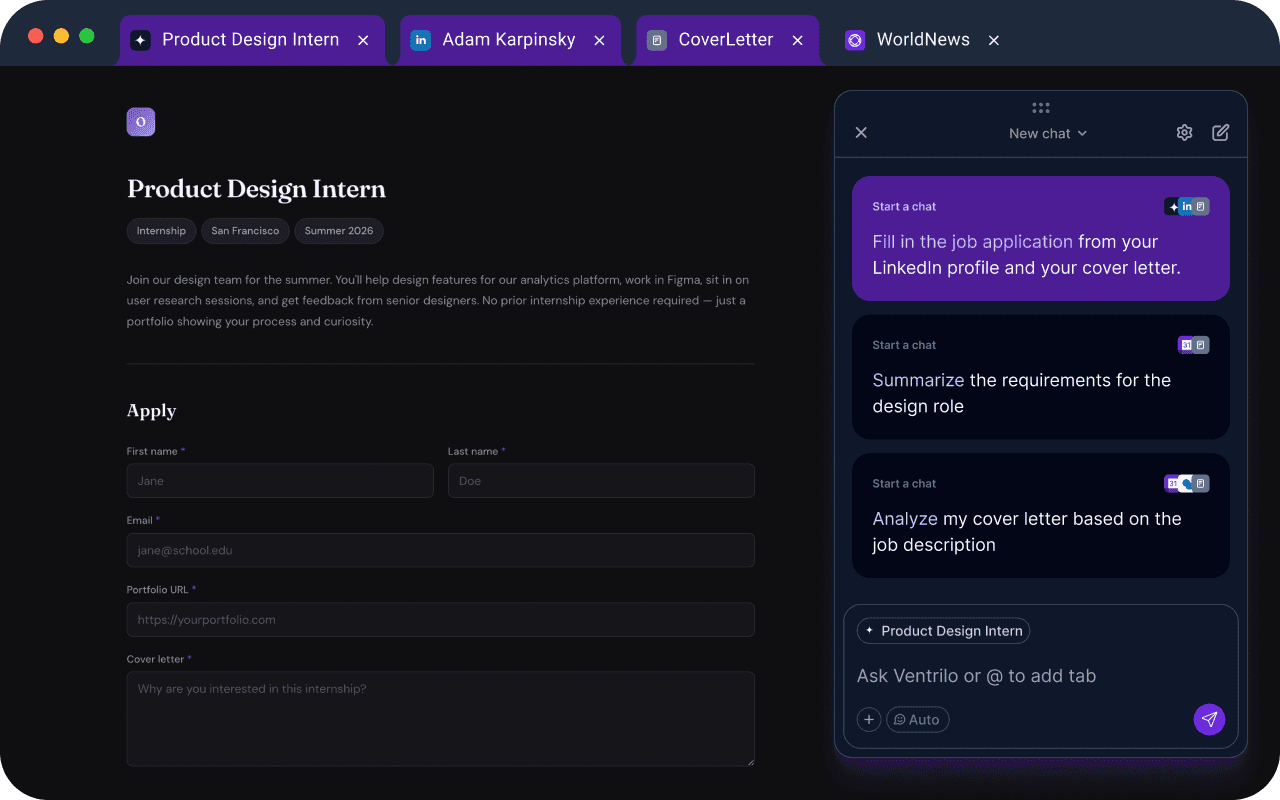 Ventrilo reads the job posting and your resume, already open in your tabs, and helps you fill in applications, tailor your materials, and keep track of what you've applied to.